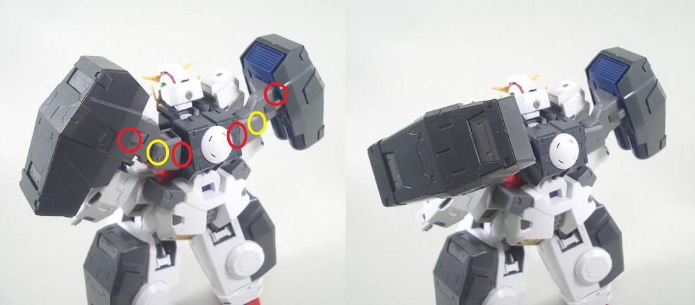 背面のGNキャノンの接続アームは赤丸部で回転し、黄丸部で上側に動きます。